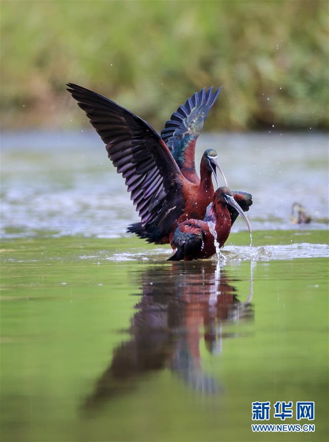 這是在漢江濕地公園嬉水的2只彩鹮(5月4日攝)。 近日,國家二級保護(hù)動(dòng)物彩鹮現(xiàn)身陜西省漢中市漢江濕地公園濂水河與漢江交匯處。 據(jù)陜西師范大學(xué)生命科學(xué)院教授于曉平介紹,彩鹮在世界上的分布比朱鹮還要少,這幾年在云南發(fā)現(xiàn)得多一些,這3只彩鹮現(xiàn)身漢江濂水河畔,是陜西首次發(fā)現(xiàn)彩鹮蹤跡。 據(jù)了解,彩鹮是國家二級保護(hù)動(dòng)物,屬鵜形目鹮科,體羽大部為青銅栗色,是珍稀鳥類朱鹮的“近親”,體型比朱鹮略小。 新華社發(fā)