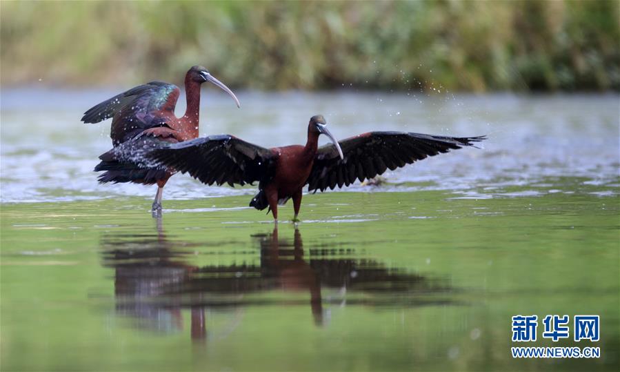 這是在漢江濕地公園嬉水的2只彩鹮(5月4日攝)。 近日,國家二級保護動物彩鹮現(xiàn)身陜西省漢中市漢江濕地公園濂水河與漢江交匯處。 據(jù)陜西師范大學生命科學院教授于曉平介紹,彩鹮在世界上的分布比朱鹮還要少,這幾年在云南發(fā)現(xiàn)得多一些,這3只彩鹮現(xiàn)身漢江濂水河畔,是陜西首次發(fā)現(xiàn)彩鹮蹤跡。 據(jù)了解,彩鹮是國家二級保護動物,屬鵜形目鹮科,體羽大部為青銅栗色,是珍稀鳥類朱鹮的“近親”,體型比朱鹮略小。 新華社發(fā)