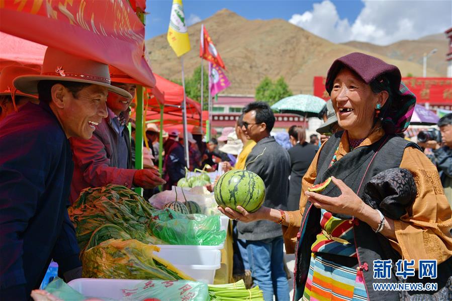 5月28日,當(dāng)?shù)剞r(nóng)牧民在白朗縣豐登廣場品嘗西瓜。 近日,西藏日喀則市白朗縣1.46萬畝瓜果蔬菜喜獲豐收。百姓們?cè)诳h里的豐登廣場載歌載舞,慶祝白朗縣第九屆果蔬采摘節(jié)。 新華社記者 張汝鋒 攝