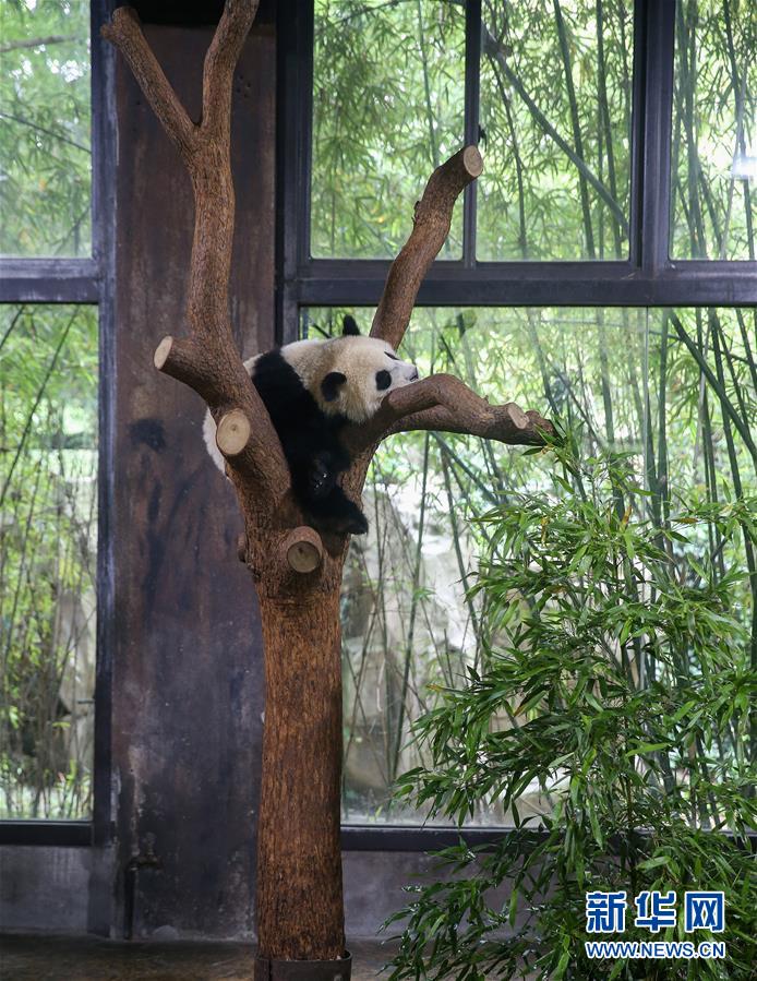 6月1日,在上海野生動(dòng)物園,大熊貓寶寶“七七”在樹(shù)上休息。當(dāng)日,上海野生動(dòng)物園舉行命名儀式,宣布一只10個(gè)月大的大熊貓寶寶被正式命名為“七七”。新華社記者丁汀攝