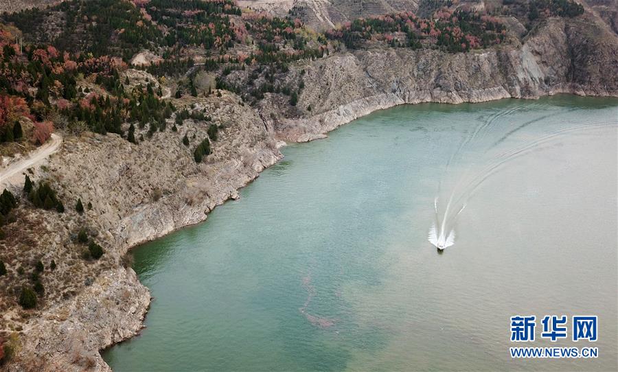 10月24日,一艘快艇從劉家峽水庫(kù)庫(kù)區(qū)駛過(無(wú)人機(jī)拍攝)。 新華社記者 陳斌 攝