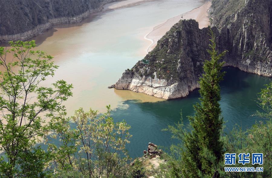 6月2日在甘肅省臨夏回族自治州永靖縣劉家峽水庫拍攝的洮河和黃河匯合水域景觀。