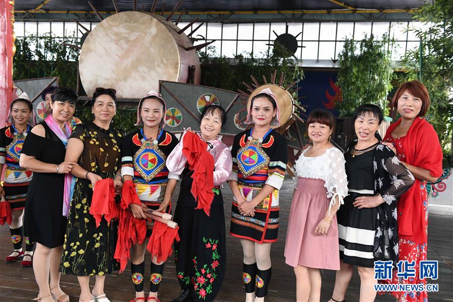 游客與基諾族大鼓舞演員合影(6月1日攝)。 在云南省西雙版納傣族自治州景洪市基諾山基諾族鄉(xiāng)的基諾族村寨,每天的基諾大鼓舞表演吸引了眾多游客前來觀賞體驗(yàn),帶動了基諾族群眾就業(yè)和增收?;Z族大鼓舞蘊(yùn)涵豐富的歷史文化內(nèi)涵,已被列入國家級非物質(zhì)文化遺產(chǎn)保護(hù)名錄。 新華社記者 楊宗友 攝