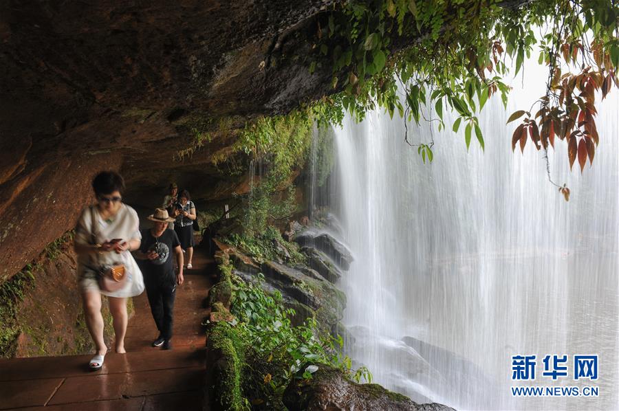 6月4日,游人在貴州赤水四洞溝景區(qū)游覽。 貴州遵義赤水市有眾多大大小小的瀑布群,素有“千瀑之市”的美譽(yù),飛瀑美景吸引八方游客前來(lái)賞景度假。 新華社記者鄭雅寧攝