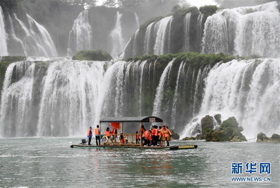 近日,隨著降雨增多,位于中越邊境的廣西大新縣德天瀑布水量增大,吸引大批游客前來(lái)觀光游覽。