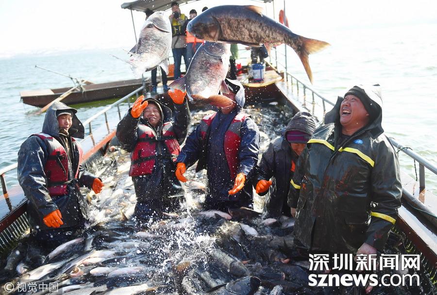 2018年12月26日,吉林松原,查干湖迎來了“紅網(wǎng)”,單網(wǎng)捕撈約30萬斤。