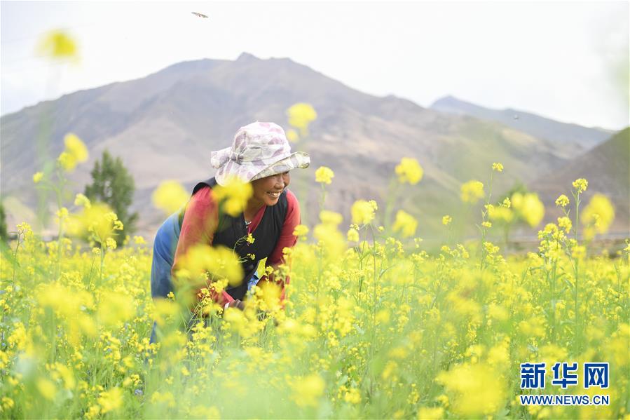 7月2日,拉薩市堆龍德慶區(qū)朗巴鄉(xiāng)村民玉珍在打理油菜花田。 近日,西藏各地的油菜花盛開,呈現(xiàn)出生機勃勃的夏日美景。 新華社記者 晉美多吉 攝