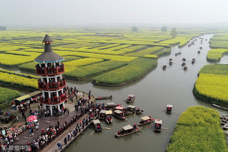 2019年4月7日,江蘇省興化市千垛菜花景區(qū)迎來旅游高峰期,數(shù)萬游客前來欣賞盛開的油菜花,樂享假日好時光。