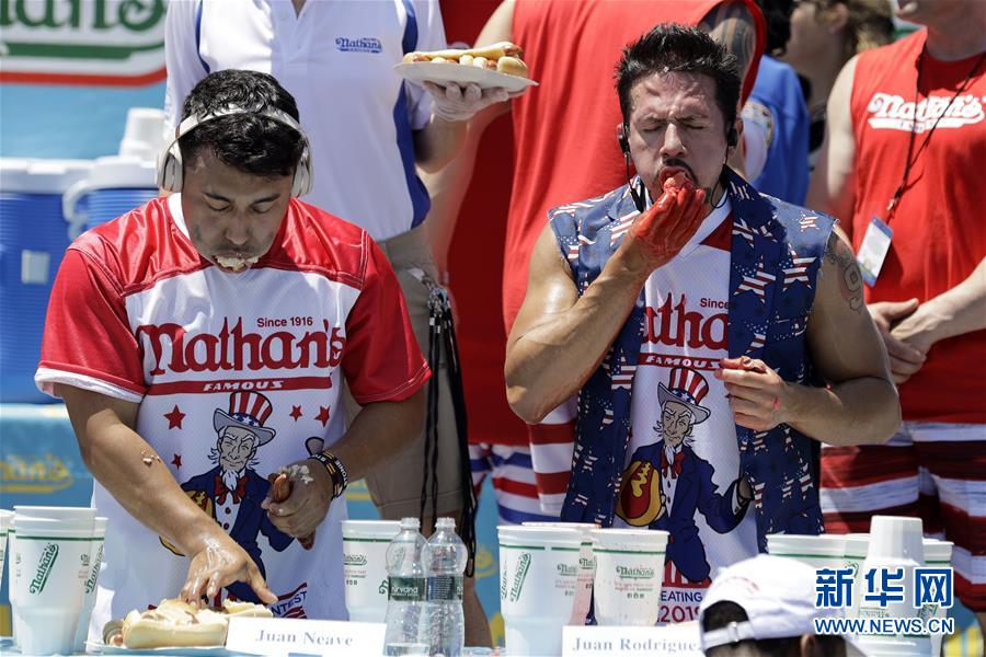 7月4日,在美國(guó)紐約康尼島,喬伊·切斯特納特(前)慶祝吃熱狗大賽奪冠。 新華社記者 李木子 攝