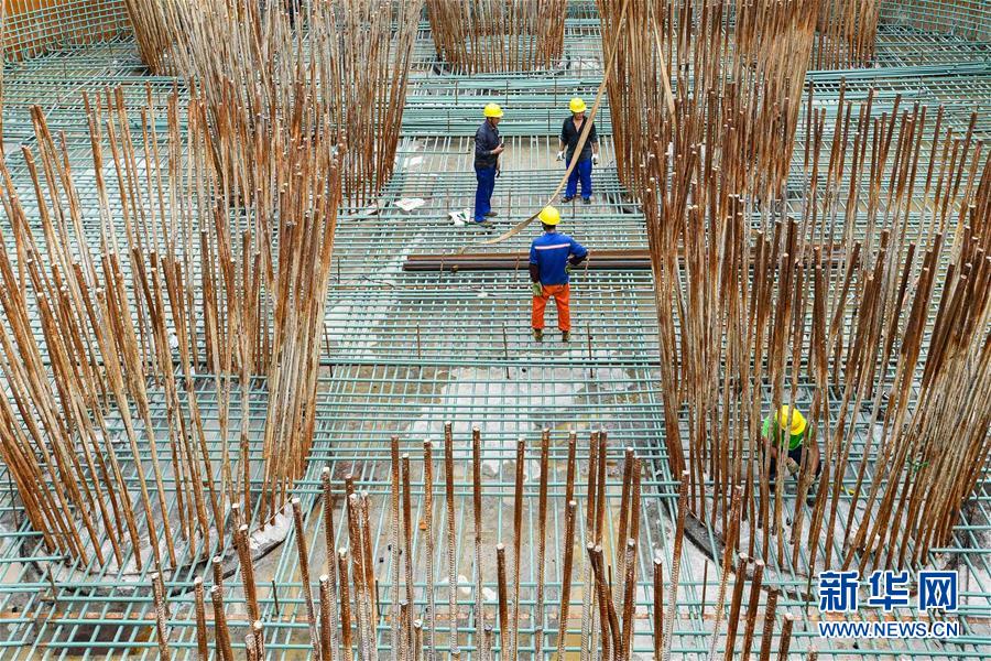 中鐵大橋局施工人員在湛江調(diào)順跨海大橋西岸主塔墩承臺綁扎鋼筋(7月6日攝)。 湛江調(diào)順跨海大橋的東岸主塔墩承臺日前順利建成,大橋步入主塔塔柱施工階段。調(diào)順跨海大橋為廣東省重點工程,大橋跨越湛江灣連接湛江市調(diào)順島及海東新區(qū),主橋為雙塔雙索面斜拉橋,主塔高136.9米,全長約9.36公里。 新華社記者 劉大偉 攝