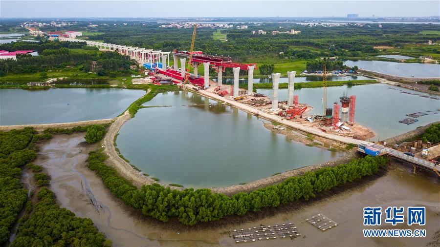 這是7月6日無(wú)人機(jī)拍攝的湛江調(diào)順跨海大橋東岸移動(dòng)模架施工現(xiàn)場(chǎng)。  新華社記者 劉大偉 攝