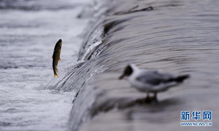 7月6日,在青海省剛察縣沙柳河里,湟魚在躍起向上洄游。 新華社記者 費(fèi)茂華攝