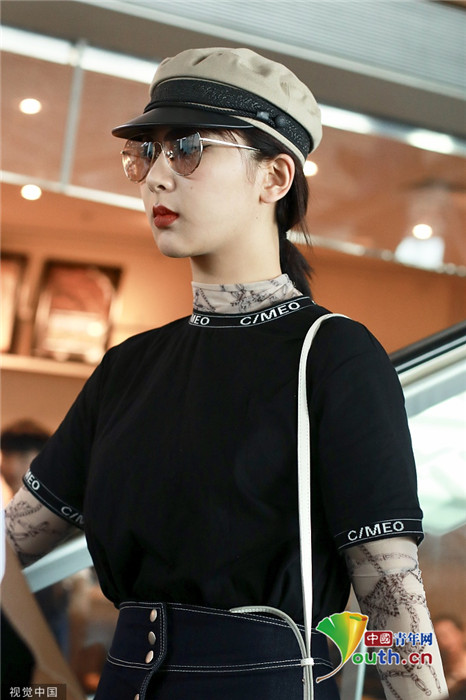 2019年7月25日,北京,楊紫現(xiàn)身機(jī)場。她穿黑色短T配牛仔裙變時髦女郎,戴報童帽架墨鏡”港風(fēng)女sir“即視感,人氣爆棚。