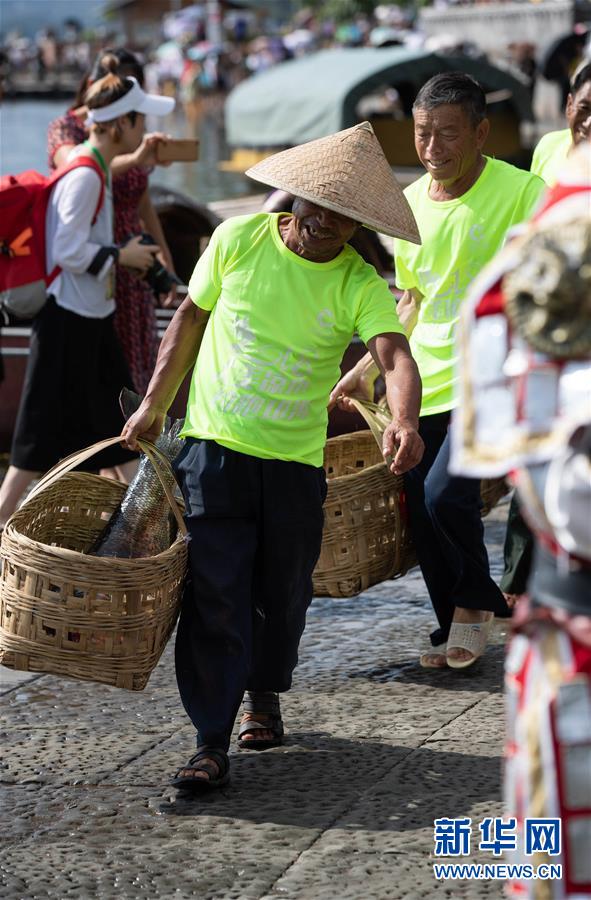7月27日,在西昌邛海,幾名漁民提著捕到的大魚準備參加比賽。新華社記者江宏景攝