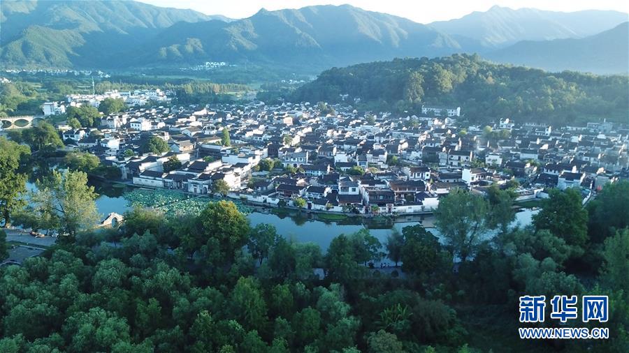這是8月4日無人機(jī)拍攝的安徽黟縣宏村風(fēng)景區(qū)晨景。