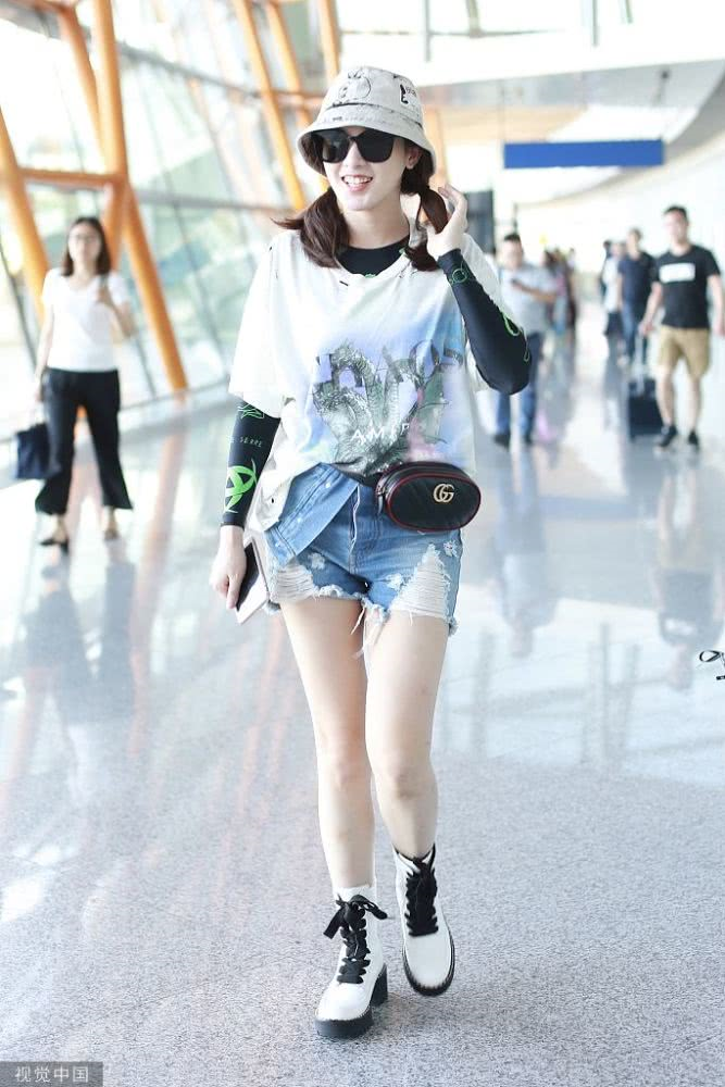 內(nèi)地女星彭小苒現(xiàn)身機(jī)場,穿印花T恤牛仔短褲,白色馬丁靴很時(shí)髦