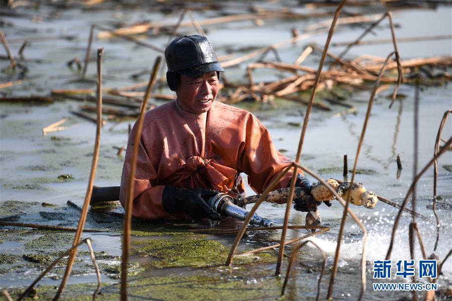 來自淮南的挖藕人王公平在肥西縣豐樂鎮(zhèn)一蓮藕種植基地收獲蓮藕。
