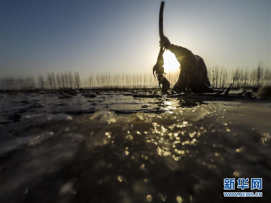 2月1日,在雄安新區(qū)安新縣東向陽村的一處藕塘,一名挖藕工在水里工作。新華社記者沈伯韓攝