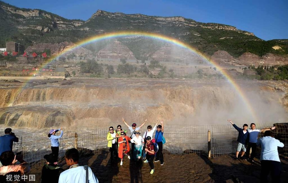 2019年8月17日,山西臨汾,游客在吉縣黃河壺口瀑布欣賞“彩虹門”景觀。