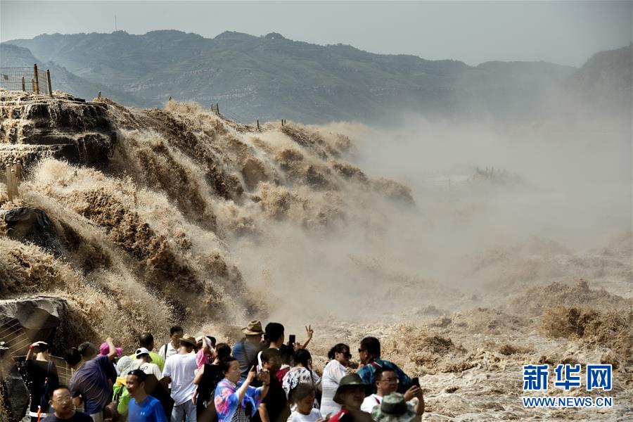 7月19日,游客在山西境內(nèi)的壺口瀑布群前留影。 新華社記者陶明 攝