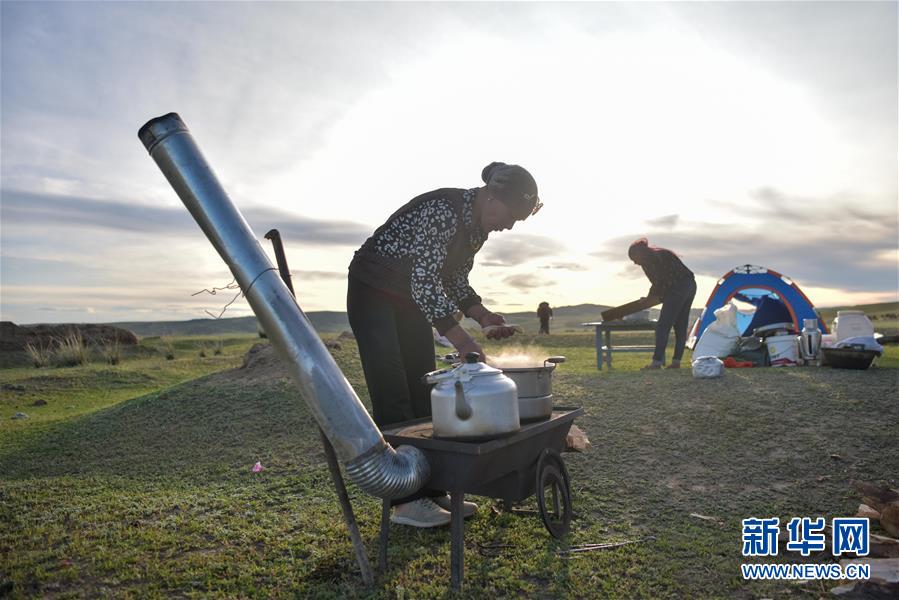 在新疆阿勒泰地區(qū)福??h,牧民在轉(zhuǎn)場(chǎng)途中生火做飯(6月5日攝)。新華社記者丁磊攝