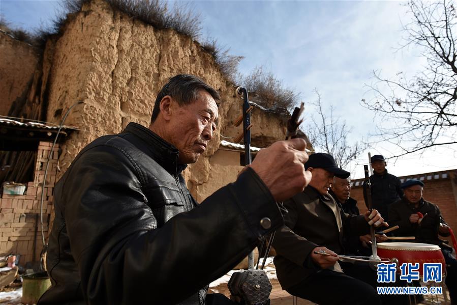 在武鄉(xiāng)縣大有鄉(xiāng)王莊溝村,村民演奏樂器為秧歌隊(duì)排練伴奏(2月15日攝)。 新華社記者 詹彥 攝
