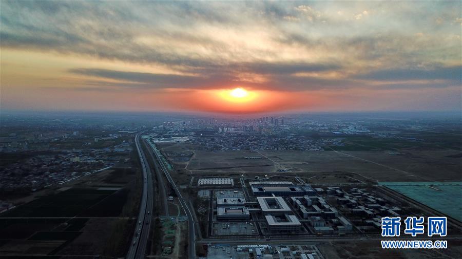 3月31日無人機拍攝的雄安新區(qū)市民服務中心(前)遠處為容城縣城區(qū)。新華社記者牟宇攝