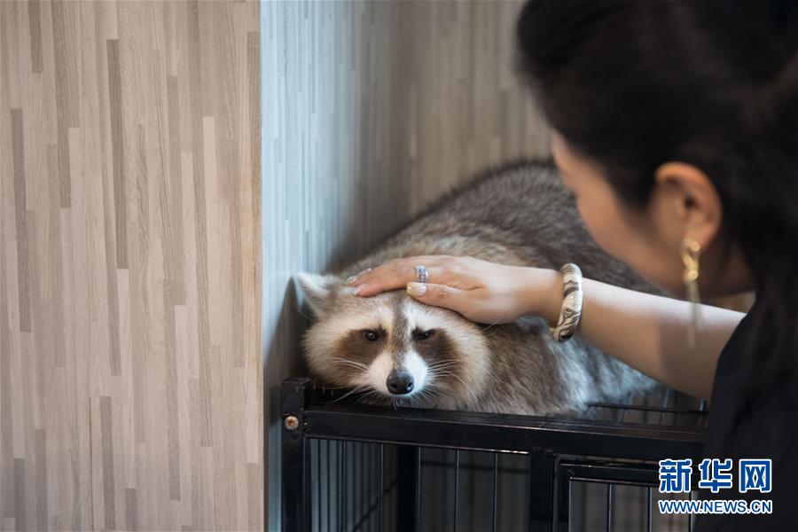 9月9日,一名顧客在曼谷動物咖啡館和一只浣熊互動。新華社記者 張可任 攝
