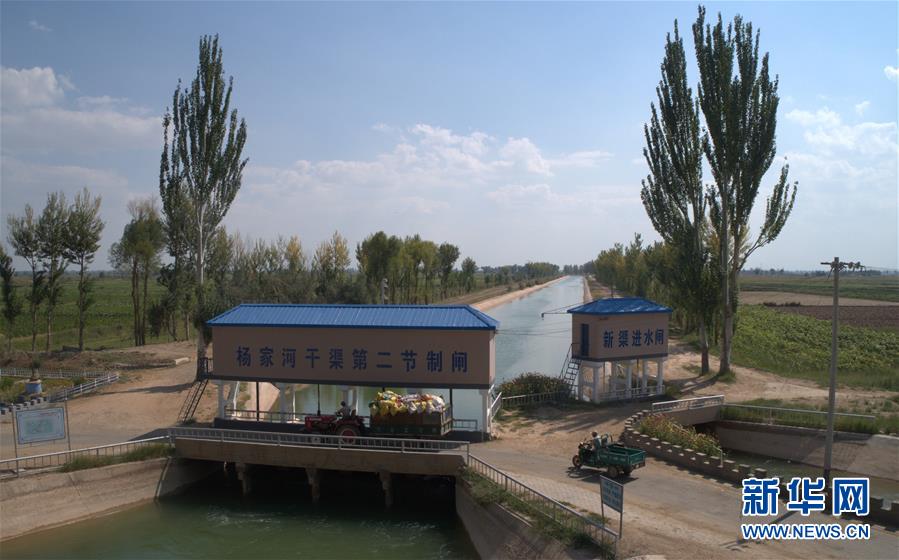 9月4日無人機(jī)拍攝的河套灌區(qū)楊家河干渠第二節(jié)制閘。 新華社記者 劉詩平 攝