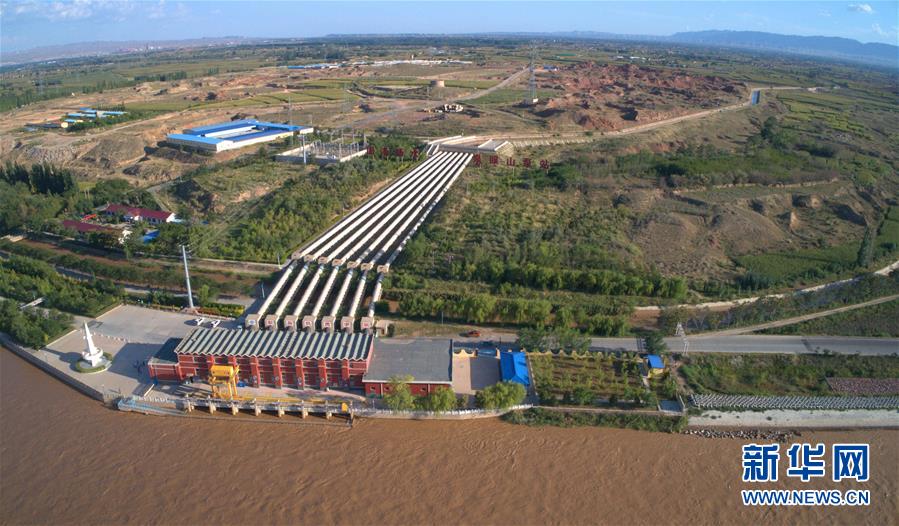 在寧夏固海揚(yáng)水工程泉眼山泵站,巨大的揚(yáng)水管道將黃河水從低處向高處抬升(8月31日無人機(jī)拍攝)。新華社記者劉詩平攝