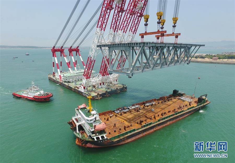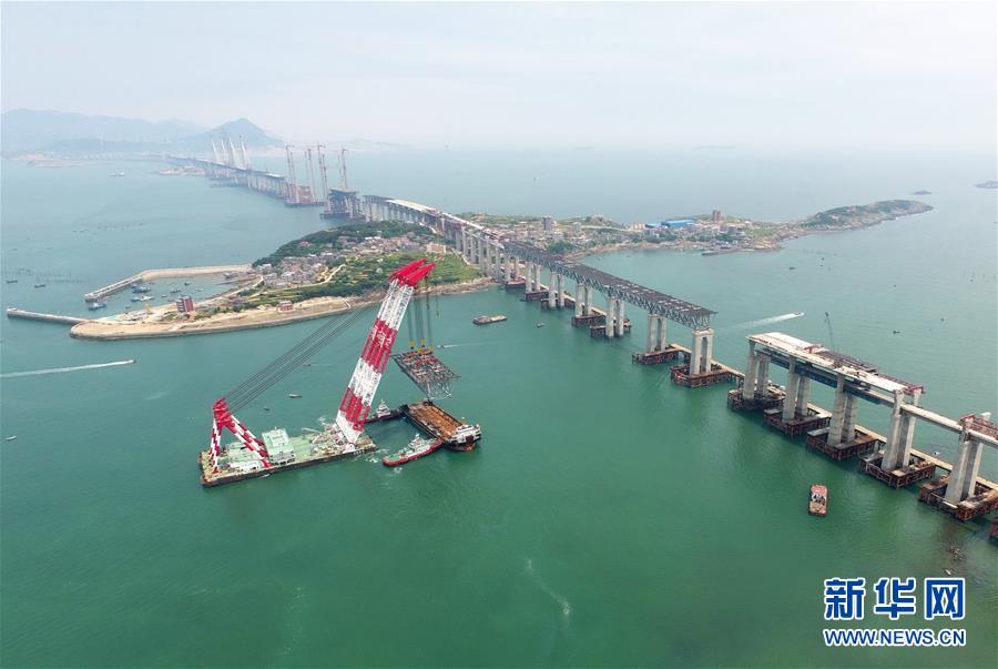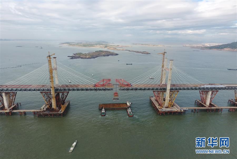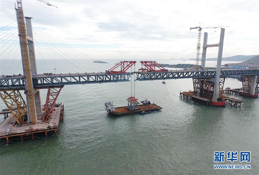 9月21日,平潭海峽公鐵大橋鼓嶼門航道橋的鋼桁梁在吊裝中(無人機(jī)拍攝)。9月25日上午,隨著一段長17米、重473噸的鋼桁梁被精確固定到位,總長16.34公里的平潭海峽公鐵大橋合龍貫通。平潭海峽公鐵大橋是福州至平潭鐵路控制性工程,也是“十三五”規(guī)劃中北京至臺(tái)灣高鐵的先期工程。大橋起于福州市長樂區(qū),“踏”過四座小島后抵達(dá)中國第五大島平潭,上層設(shè)計(jì)為時(shí)速100公里的六車道高速公路,下層為設(shè)計(jì)時(shí)速200公里的高鐵。據(jù)福建福平鐵路公司介紹,大橋計(jì)劃2020年正式通車。在六年建設(shè)過程中,平潭海峽公鐵大橋所應(yīng)用研發(fā)的多項(xiàng)技術(shù)、裝備創(chuàng)下國內(nèi)外紀(jì)錄。新華社記者林善傳攝
