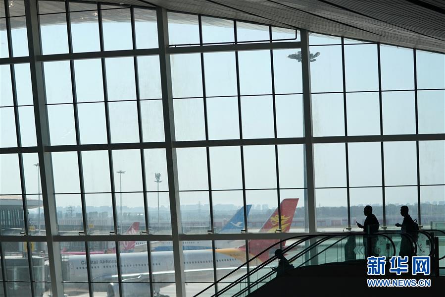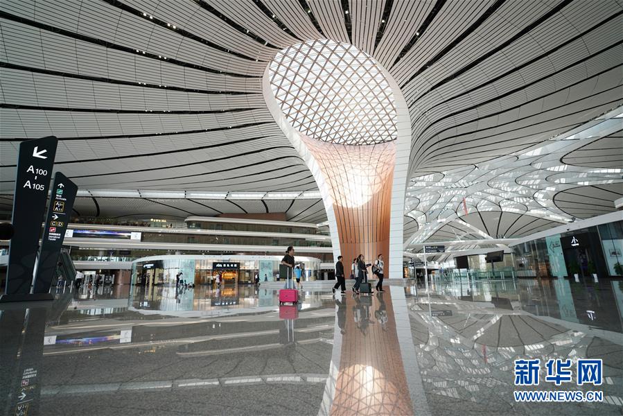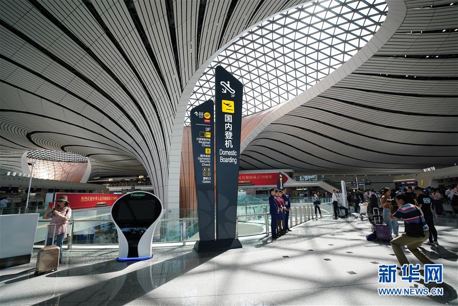 9月25日,中國(guó)南方航空公司的CZ3001次航班從北京大興國(guó)際機(jī)場(chǎng)起飛。當(dāng)日,北京大興國(guó)際機(jī)場(chǎng)正式通航。北京大興國(guó)際機(jī)場(chǎng)位于北京市大興區(qū)和河北省廊坊市廣陽(yáng)區(qū)之間,與天安門直線距離為46公里,是目前全球建設(shè)規(guī)模最大的新建機(jī)場(chǎng)。新華社記者鞠煥宗攝