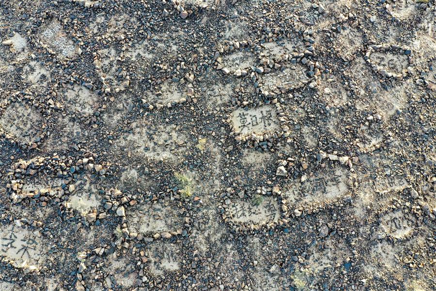 這是內蒙古自治區(qū)額濟納旗算井子邊境派出所民警在大紅山上用石塊擺成的姓名和各種字樣(9月27日無人機拍攝)。新華社記者劉磊攝