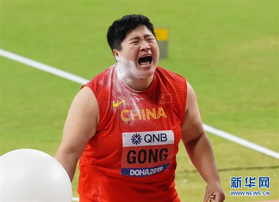 當(dāng)日,在卡塔爾多哈舉行的2019國際田聯(lián)世界田徑錦標(biāo)賽女子鉛球決賽中,衛(wèi)冕冠軍、中國選手鞏立姣以19米55的成績奪得冠軍。 新華社記者王婧嬙攝