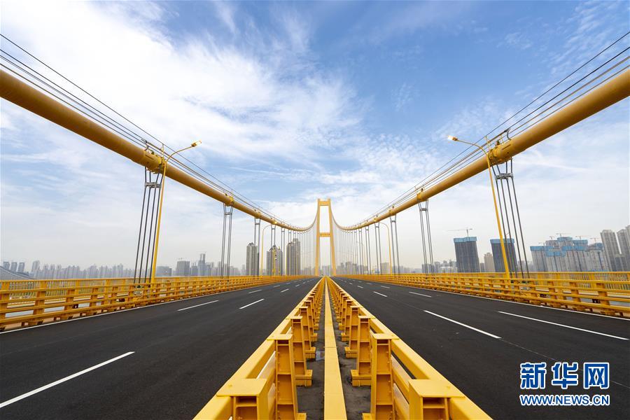 楊泗港大橋建設創(chuàng)造了多項世界之最:一是主橋跨度達1700米,為世界上跨度最大的雙層懸索橋;二是主橋設置雙層雙向12車道,是世界上通行能力最大的公路橋梁;三是大橋主纜設計張力6.5萬噸,采用了世界上強度等級最高的主纜鋼絲;四是大橋設置機動車道、非機動車道、人行觀光道,集過江交通與觀光于一體,是長江上功能最完備的橋梁。新華社記者熊琦攝