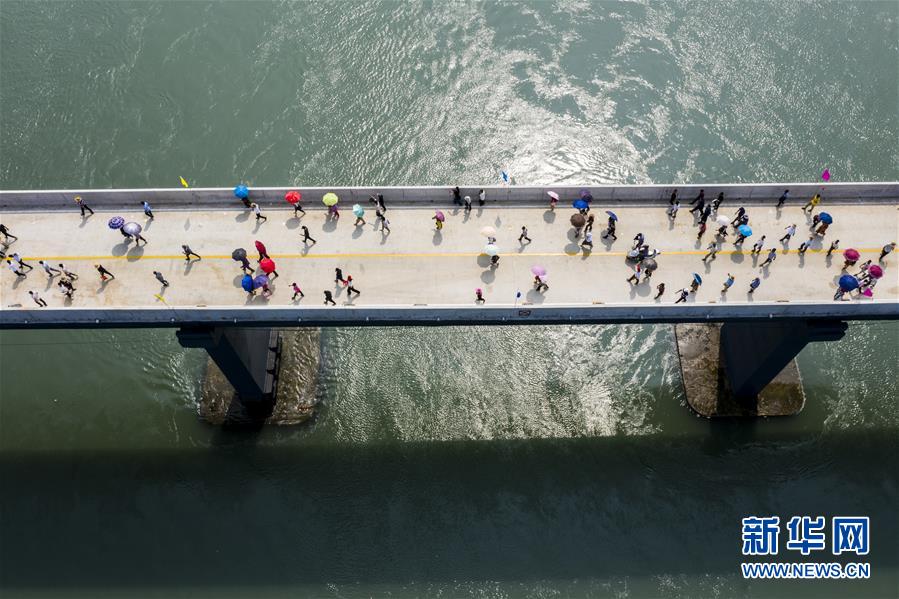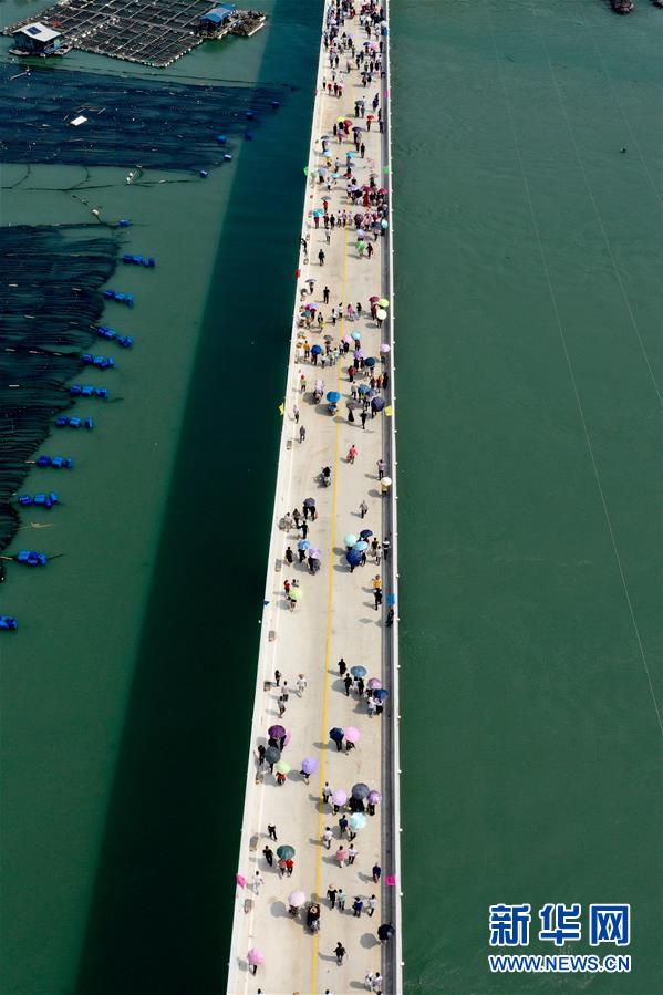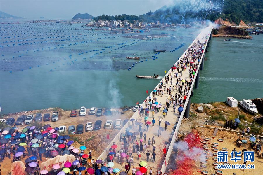 10月12日,福建省霞浦縣東安島海防大橋正式通車,這是當地群眾走在新橋上(無人機拍攝)。新華社記者姜克紅攝