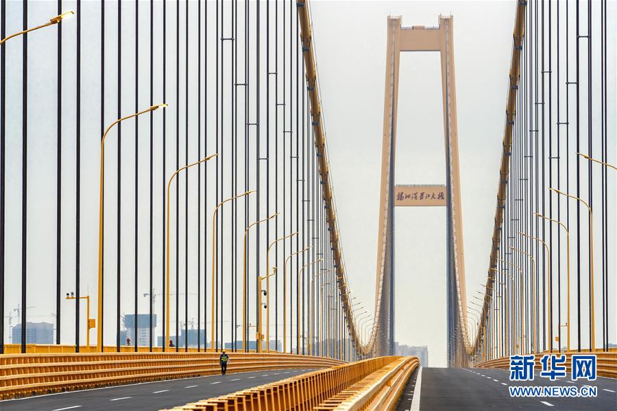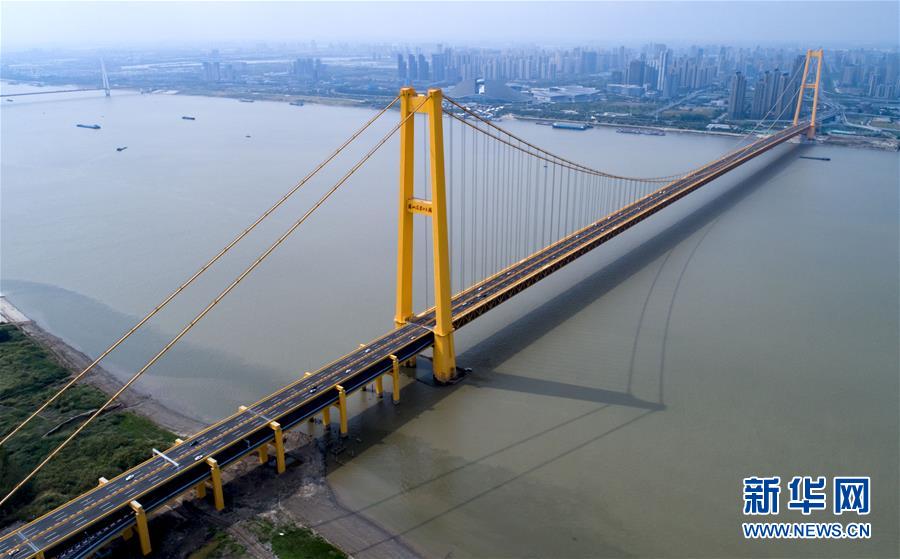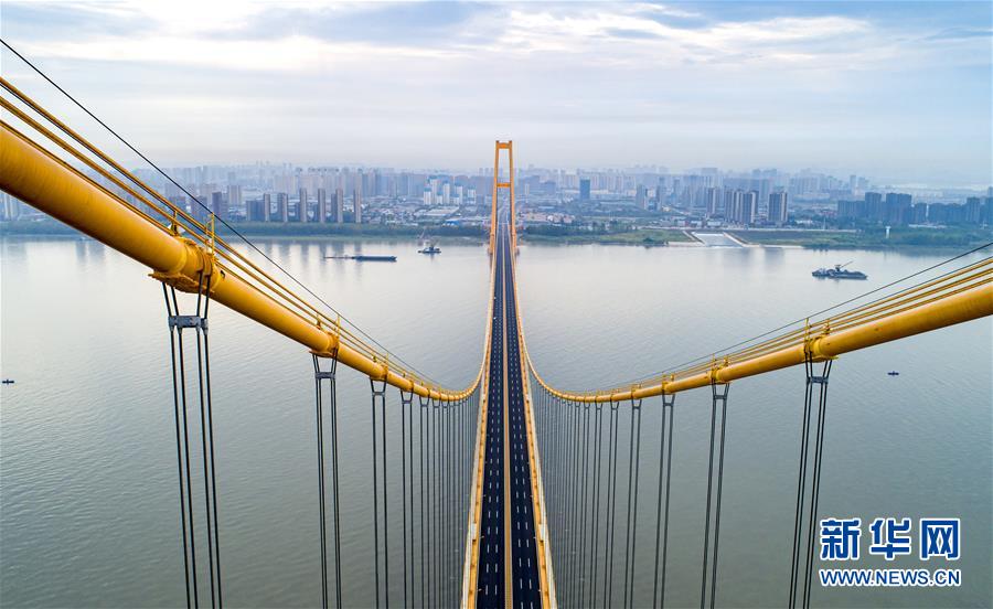 楊泗港大橋建設創(chuàng)造了多項世界之最:一是主橋跨度達1700米,為世界上跨度最大的雙層懸索橋;二是主橋設置雙層雙向12車道,是世界上通行能力最大的公路橋梁;三是大橋主纜設計張力6.5萬噸,采用了世界上強度等級最高的主纜鋼絲;四是大橋設置機動車道、非機動車道、人行觀光道,集過江交通與觀光于一體,是長江上功能最完備的橋梁。新華社記者熊琦攝