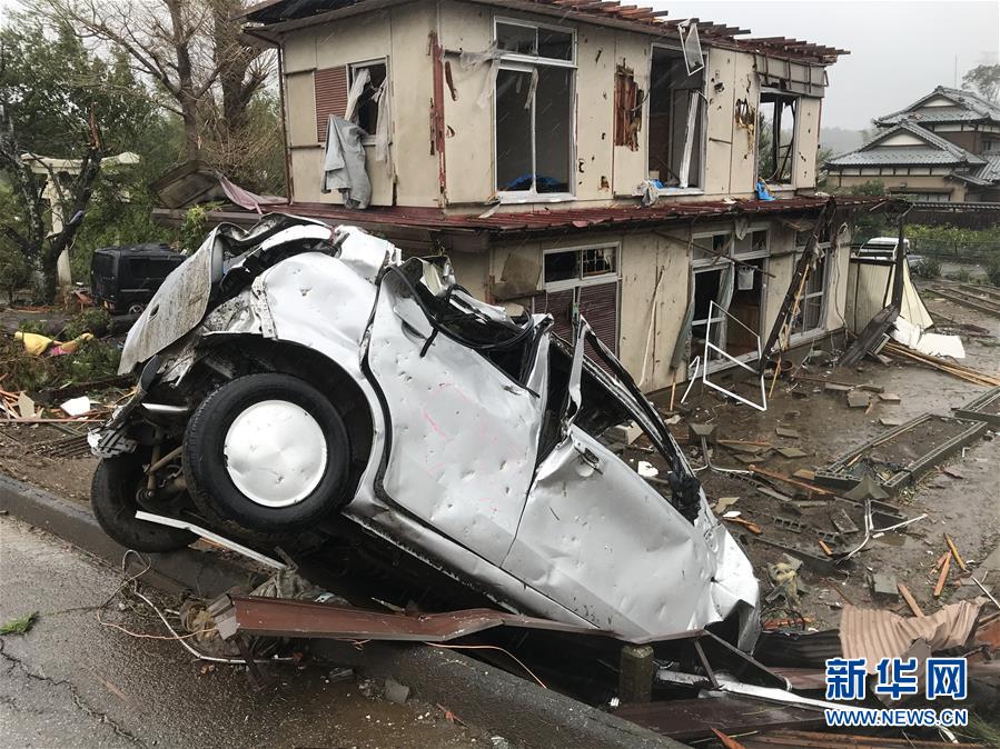 10月12日,在日本千葉縣,一輛汽車遭龍卷風襲擊后被損毀。