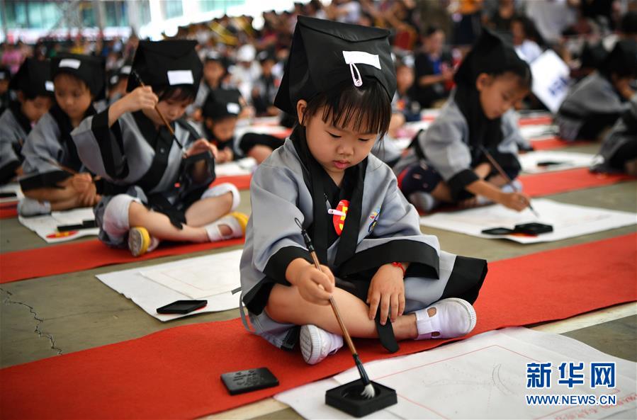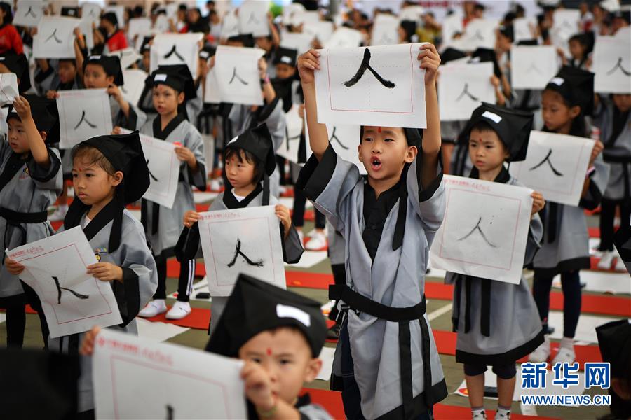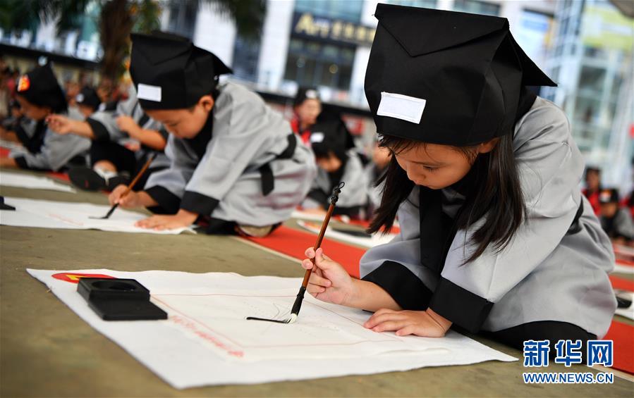 10月13日,參加儀式的小朋友在宣讀開筆誓言。當(dāng)日,??诤嬌賰核囆g(shù)中心為500名小朋友舉行“開筆禮”,通過“點(diǎn)朱砂,啟智慧”“習(xí)書法,描人字”等儀式讓孩子們體驗(yàn)中國傳統(tǒng)文化。新華社記者郭程攝