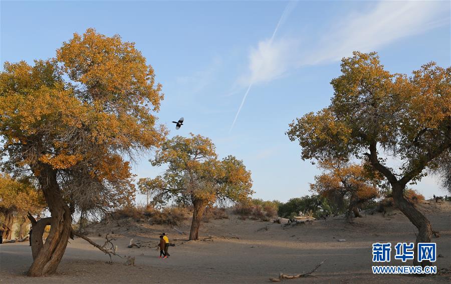 10月16日,游客在內(nèi)蒙古自治區(qū)額濟(jì)納旗的胡楊林游覽。新華社記者丁洪法攝