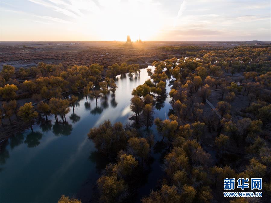 這是在內(nèi)蒙古自治區(qū)額濟(jì)納旗拍攝的胡楊林(10月10日無人機(jī)拍攝)。金秋時節(jié),內(nèi)蒙古自治區(qū)額濟(jì)納旗胡楊林如同披上金裝,成為大漠中的一抹亮色,吸引眾多中外游客前來觀賞游玩。新華社記者劉磊攝