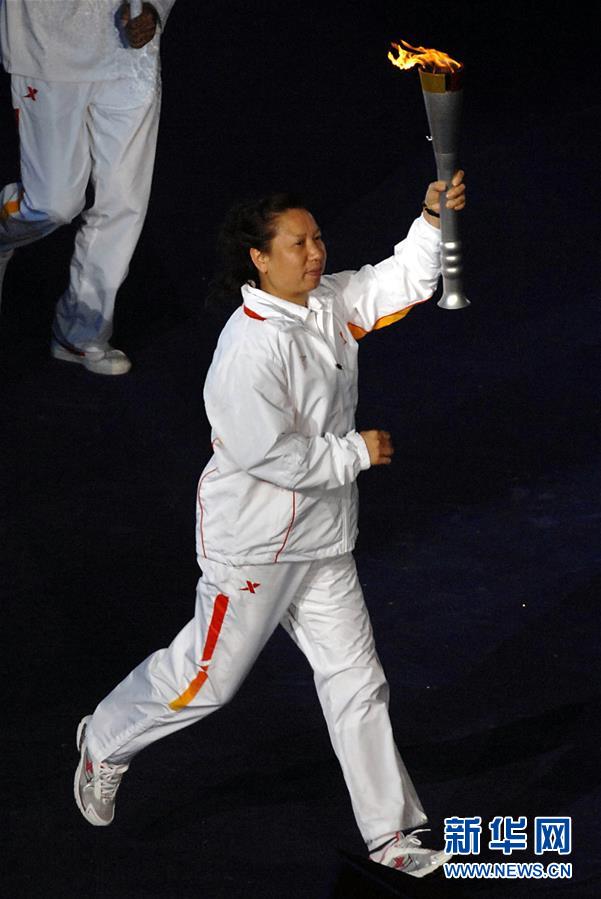 圖為韓愛萍在武漢舉行的第六屆全國城市運(yùn)動(dòng)會(huì)開幕式上傳遞火炬(2007年10月25日攝)。新華社記者王頌攝