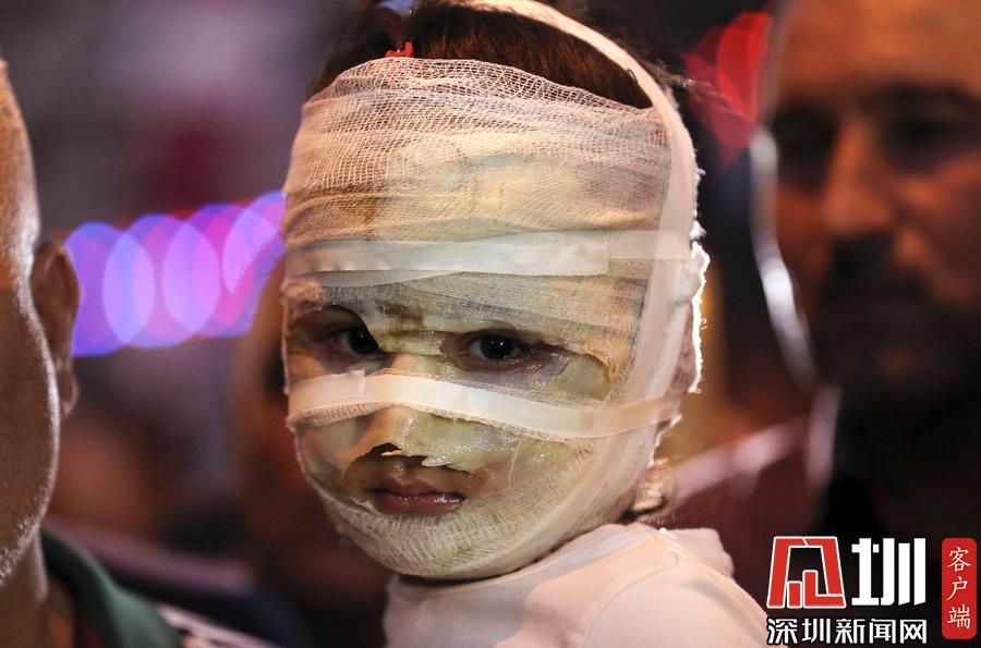 當(dāng)?shù)貢r(shí)間2016年7月9日,伊拉克卡拉達(dá),4歲的Asal Ahmed在爆炸現(xiàn)場被爸爸抱著。開齋節(jié)期間,Asal和媽媽一起逛街,結(jié)果碰上一起自殺性炸彈襲擊,兩人都嚴(yán)重?zé)齻?/p>