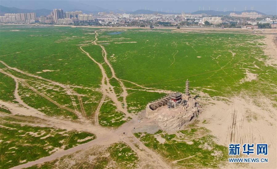 這是在江西省廬山市拍攝的鄱陽湖湖區(qū)(10月9日無人機(jī)拍攝)。隨著水位下降,湖底的落星墩也展現(xiàn)出來。新華社記者胡晨歡攝
