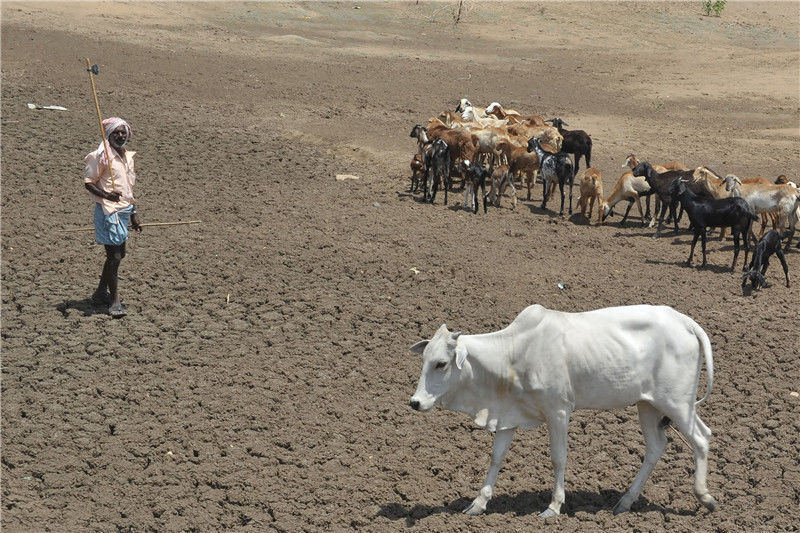 當(dāng)?shù)貢r(shí)間2017年5月30日,印度特倫甘納,印度農(nóng)民在干涸的河床上放羊和牛。NOAH SEELAM/視覺中國(guó)編輯/陳進(jìn)