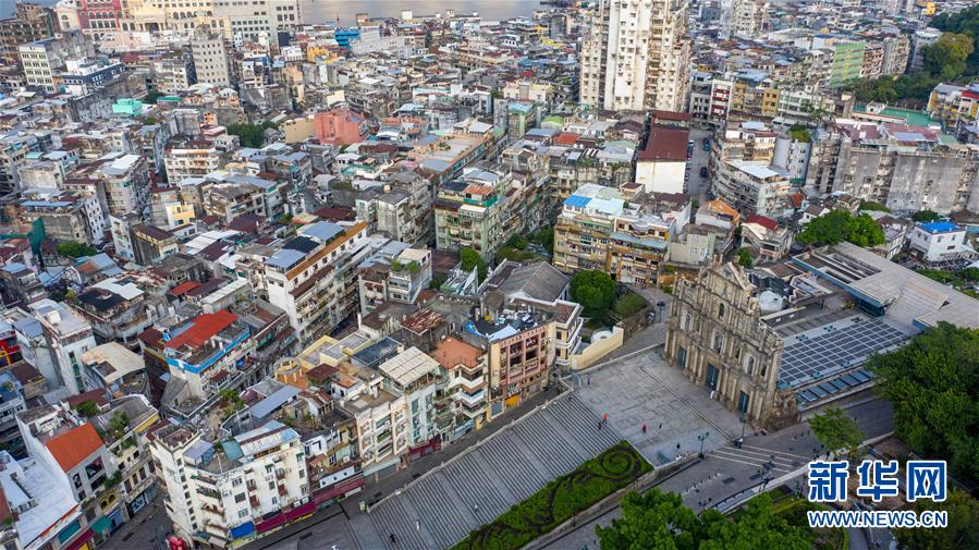 10月24日早晨無人機拍攝的澳門著名歷史遺跡——大三巴牌坊及周邊區(qū)域。2018年10月23日,港珠澳大橋正式開通。新華社記者張金加攝