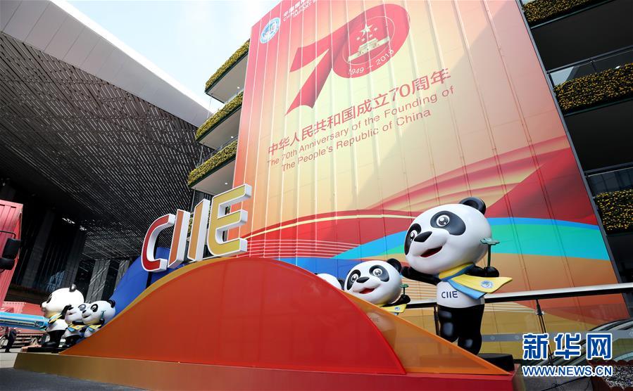 10月25日,國家會展中心(上海)內(nèi)慶祝國慶的裝飾前擺放了進博會標識和吉祥物熊貓進寶。 新華社記者 方喆攝