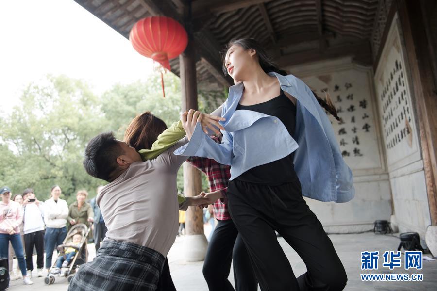 10月26日,一個劇團在烏鎮(zhèn)街頭表演戲劇。 新華社記者翁忻旸攝