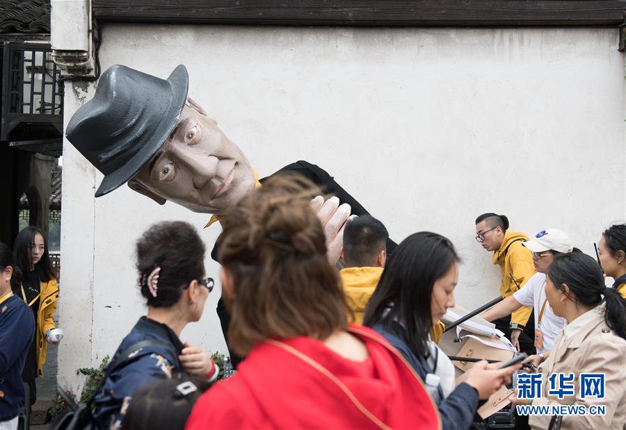 10月26日,游客經(jīng)過一個正在豎起的戲劇人偶。 新華社記者翁忻旸攝
