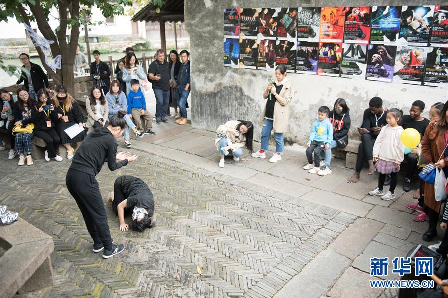 10月26日,一個(gè)劇團(tuán)在烏鎮(zhèn)街頭表演戲劇。 新華社記者翁忻旸攝